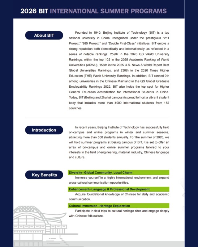 Join the 2026 BIT International Summer Programs (Beijing campus) and explore cutting-edge fields while immersing yourself in a truly global learning environment.