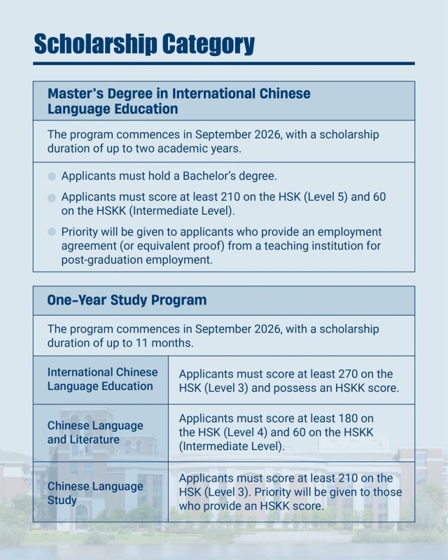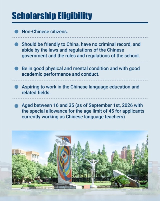 The 𝗜𝗻𝘁𝗲𝗿𝗻𝗮𝘁𝗶𝗼𝗻𝗮𝗹 𝗖𝗵𝗶𝗻𝗲𝘀𝗲 𝗟𝗮𝗻𝗴𝘂𝗮𝗴𝗲 𝗧𝗲𝗮𝗰𝗵𝗲𝗿𝘀 𝗦𝗰𝗵𝗼𝗹𝗮𝗿𝘀𝗵𝗶𝗽 (𝗜𝗖𝗟𝗧𝗦) by CLEC supports outstanding students interested in Chinese language studies and in-service Chinese language teachers worldwide. 𝗭𝗵𝗲𝗷𝗶𝗮𝗻𝗴 𝗨𝗻𝗶𝘃𝗲𝗿𝘀𝗶𝘁𝘆 𝗼𝗳 𝗧𝗲𝗰𝗵𝗻𝗼𝗹𝗼𝗴𝘆 (𝗭𝗝𝗨𝗧) warmly welcomes qualified applicants for the 𝗦𝗲𝗽𝘁𝗲𝗺𝗯𝗲𝗿 𝟮𝟬𝟮𝟲 𝗶𝗻𝘁𝗮𝗸𝗲. 🌏📚