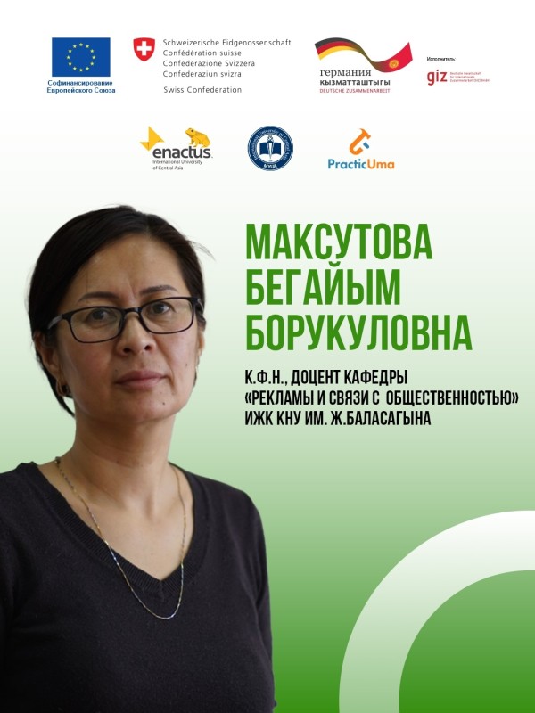 🎙 Максутова Бегайым Борукуловна — к.ф.н., доцент кафедры «Реклама и связи с общественностью» ИЖК КНУ им. Ж. Баласагына;