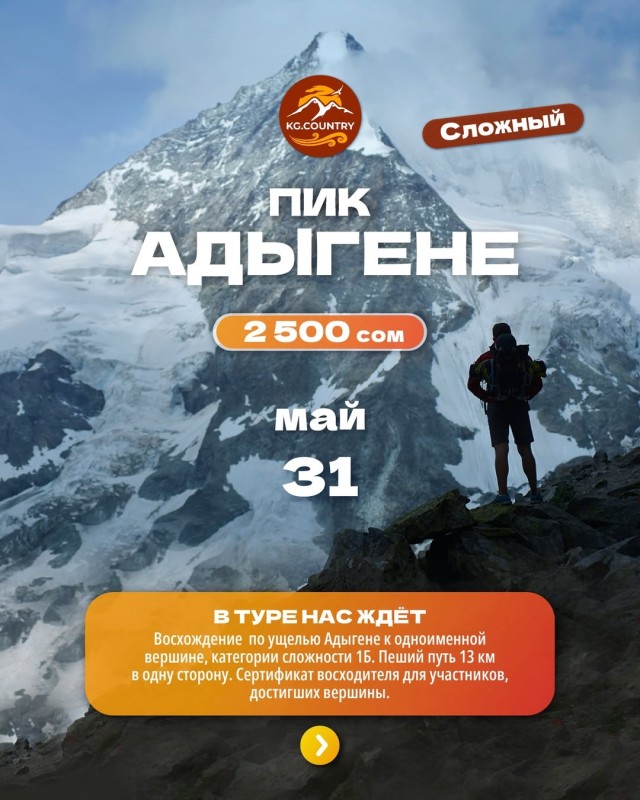🏔Высота пика Адыгене 4360 м.н.у.м, протяженность пути составляет 13 км в одну сторону. Набор высоты от точки старта составит примерно 2200 метров.