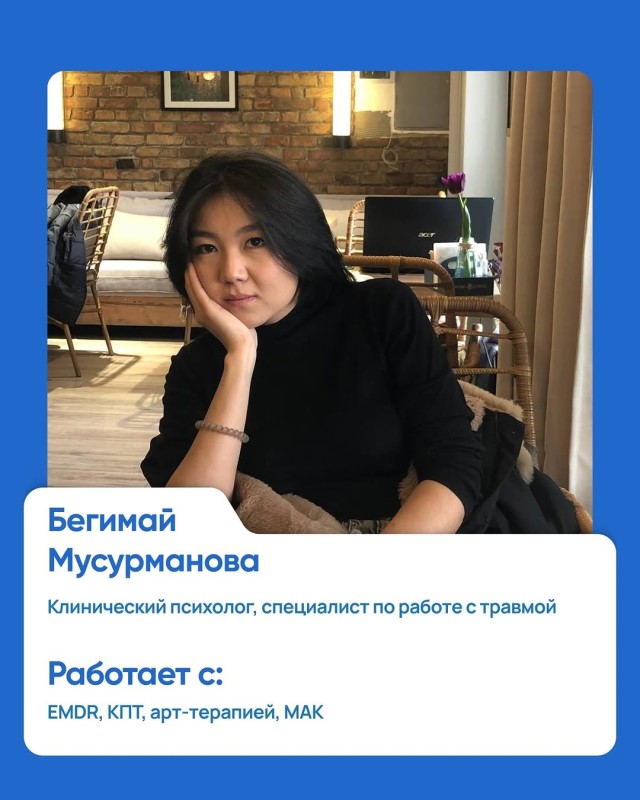 👩⚕️ Бегимай Мусурманова – клинический психолог. В работе сочетает EMDR, КПТ и арт-терапию, помогает бережно восстанавливать внутреннюю устойчивость.