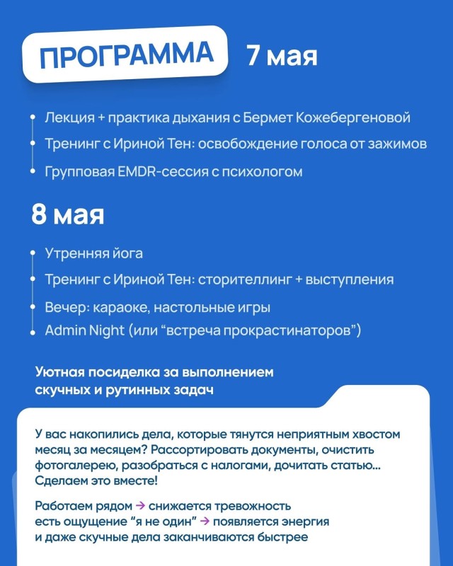 Участников ждет работа с голосом через практики, тексты и выступления, знакомство с новыми способами самовыражения, обратная связь и постепенное возвращение внутренней опоры 🌀
