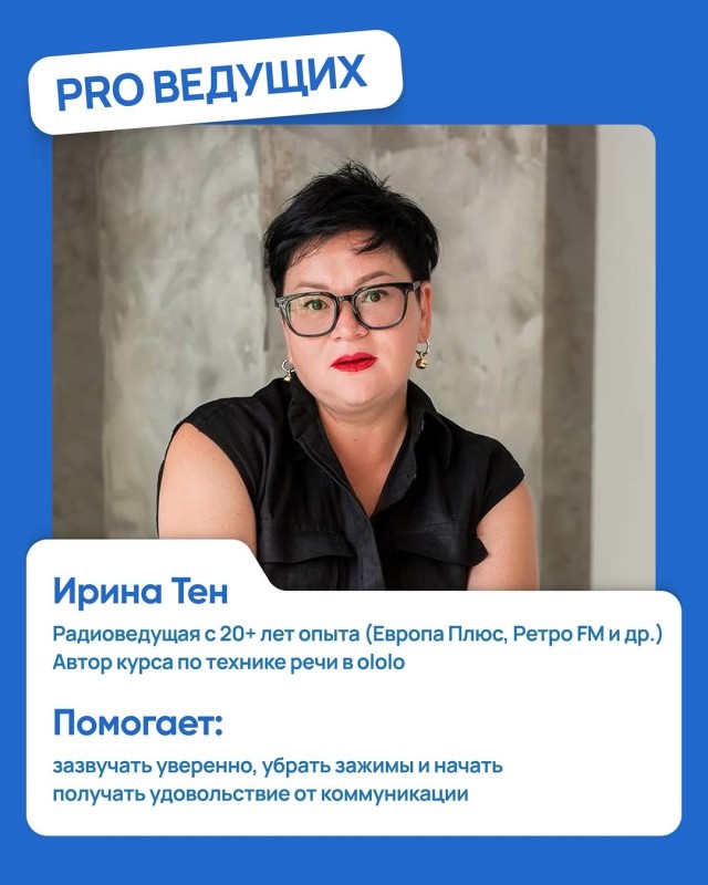 🎤 Ирина Тен – более 20 лет в радио, тренер по технике речи, преподаватель и ведущая. Работает с голосом и публичными выступлениями, помогает звучать уверенно и свободно.