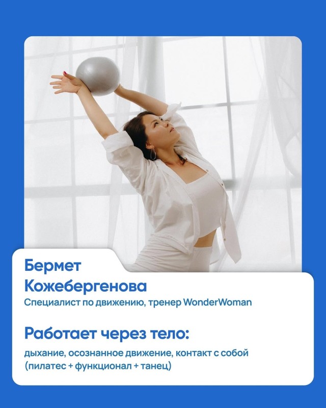 🧘🏼 Бермет Кожебергенова – специалист по движению и телесной осознанности. Работает с телом через практики, соединяя пилатес, функциональный тренинг и танец.