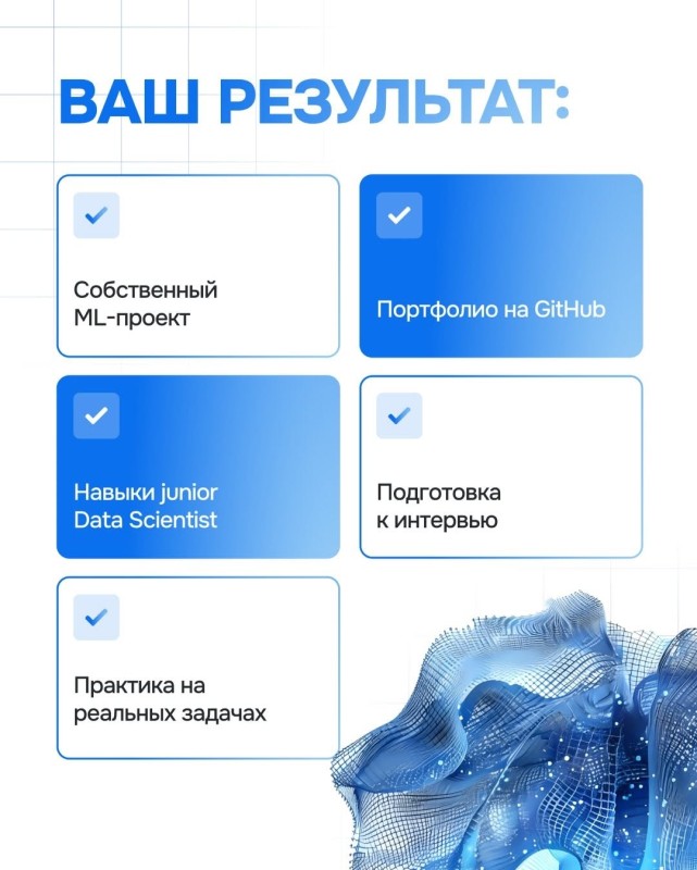 За время обучения ты соберёшь портфолио, сделаешь свой ML-проект и подготовишься к собеседованиям.