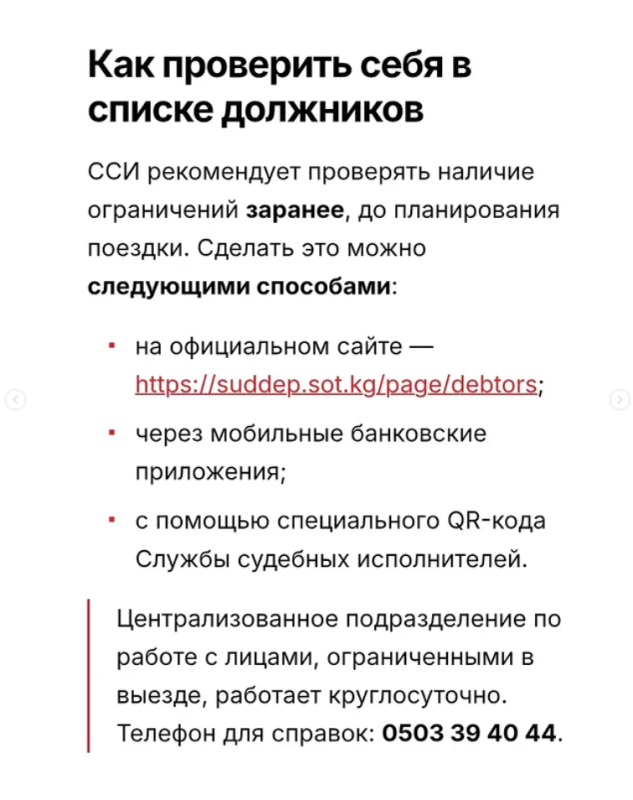 — Служба судебных исполнителей (ССИ) при Генеральной прокуратуре предоставила официальное разъяснение о порядке наложения и снятия временных ограничений на выезд граждан за пределы Кыргызстана. По данным ведомства, основания для запрета и процедура его отмены зависят от характера задолженности и органа, вынесшего решение.