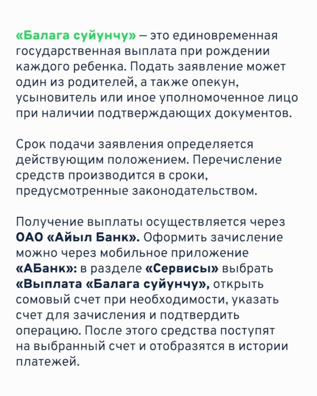Получение выплаты осуществляется через ОАО «Айыл Банк». Оформить зачисление можно через мобильное приложение «АБанк»: в разделе «Сервисы» выбрать «Выплата «Балага суйунчу», открыть сомовый счет при необходимости, указать счет для зачисления и подтвердить операцию. После этого средства поступят на выбранный счет и отобразятся в истории платежей.