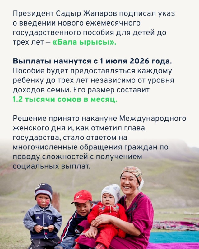 Выплаты начнутся с 1 июля 2026 года. Пособие будет предоставляться каждому ребенку до трех лет независимо от уровня доходов семьи. Его размер составит 1.2 тысячи сомов в месяц.