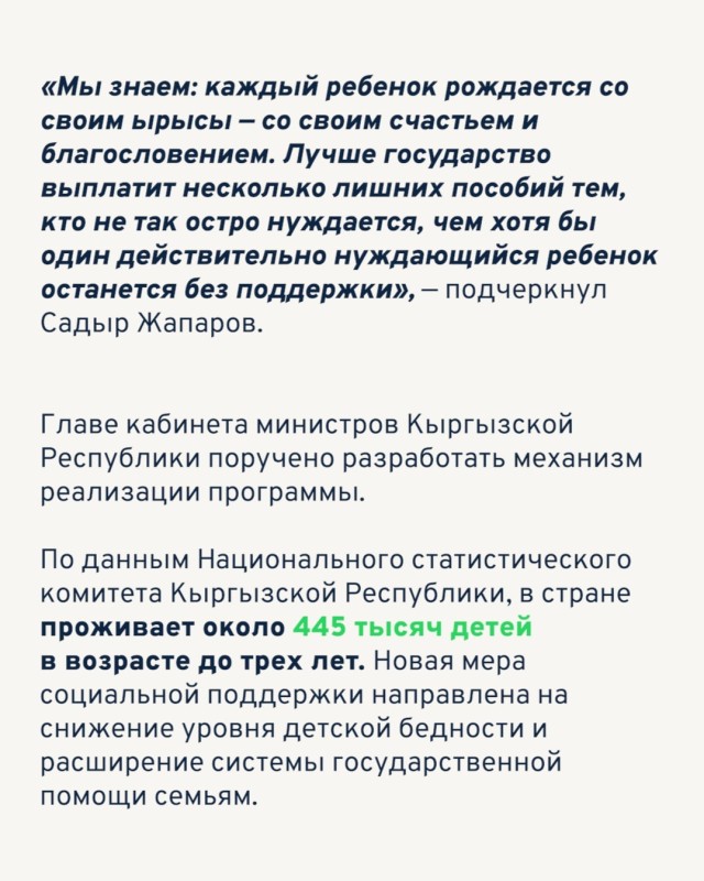 «Мы знаем: каждый ребенок рождается со своим ырысы — со своим счастьем и благословением. Лучше государство выплатит несколько лишних пособий тем, кто не так остро нуждается, чем хотя бы один действительно нуждающийся ребенок останется без поддержки», — подчеркнул Садыр Жапаров.