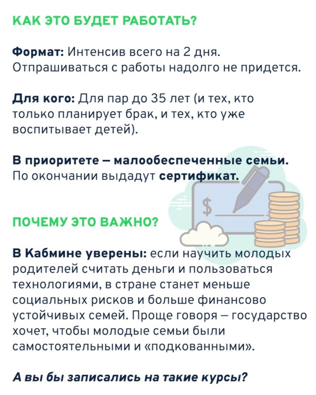 Согласно утвержденному порядку, обучение будет проводиться для граждан в возрасте до 35 лет, вступающих в брак или уже воспитывающих детей. Курсы предполагают развитие навыков планирования семейного бюджета, рационального управления доходами и расходами, а также освоение цифровых инструментов, необходимых для повседневной жизни — от онлайн-платежей до использования государственных электронных сервисов.