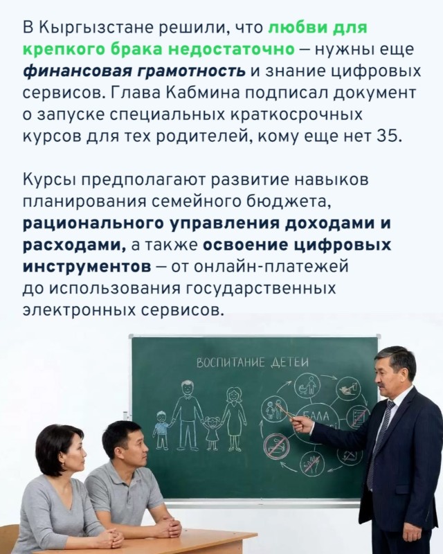 В Кыргызстане утверждено Положение о разработке учебных программ и проведении краткосрочных курсов для молодых родителей. Соответствующее решение подписал председатель кабинет министров Адылбек Касымалиев. Документ направлен не только на укрепление института семьи, но и на повышение финансовой и цифровой грамотности молодых семей.