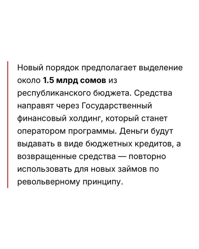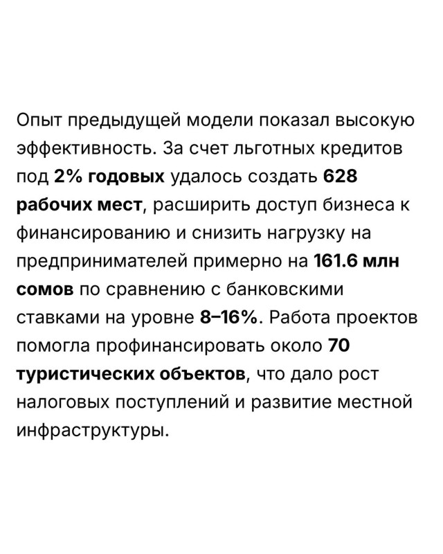 — В Кыргызстане готовят запуск новой модели поддержки регионов через льготное кредитование бизнеса. Кабмин вынес на общественное обсуждение проект постановления, который закрепляет порядок реализации программы «Экономическое развитие регионов». Фактически власти предлагают перезапустить механизм финансирования после его недавней остановки.