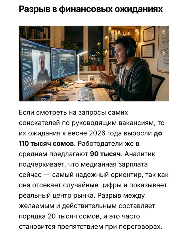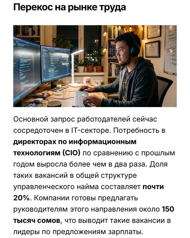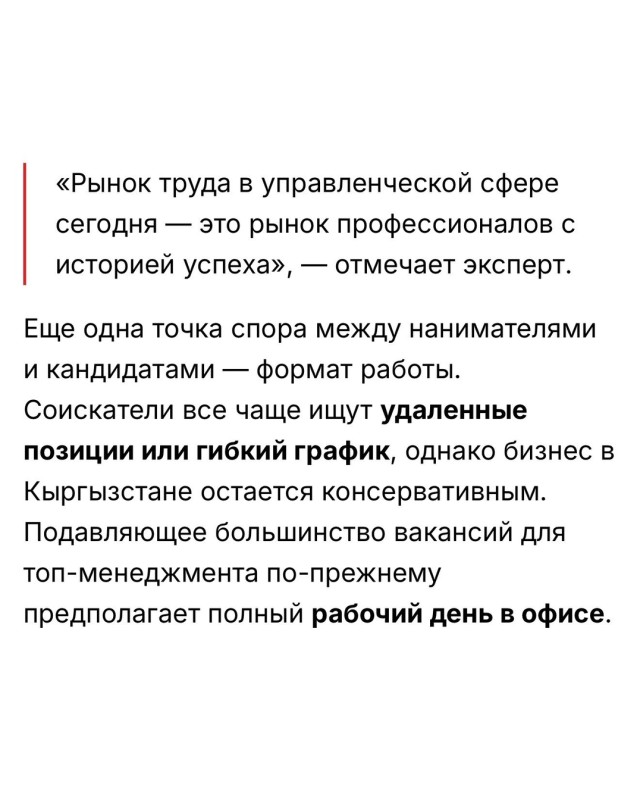 — Компаниям в Кыргызстане не хватает узких специалистов-руководителей с опытом, но на одну стандартную административную вакансию претендуют десятки человек. Аналитик Нeadhunter.kg Мухамед Багдатулы отмечает, что управленческий сектор по сравнению с прошлым годом изменился: бизнес стал более прагматичным в вопросах найма и оплаты труда.