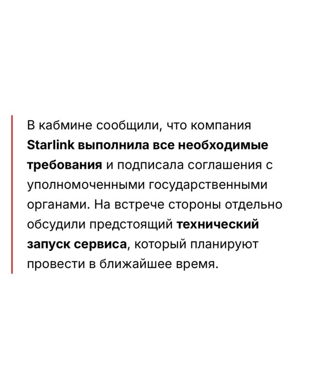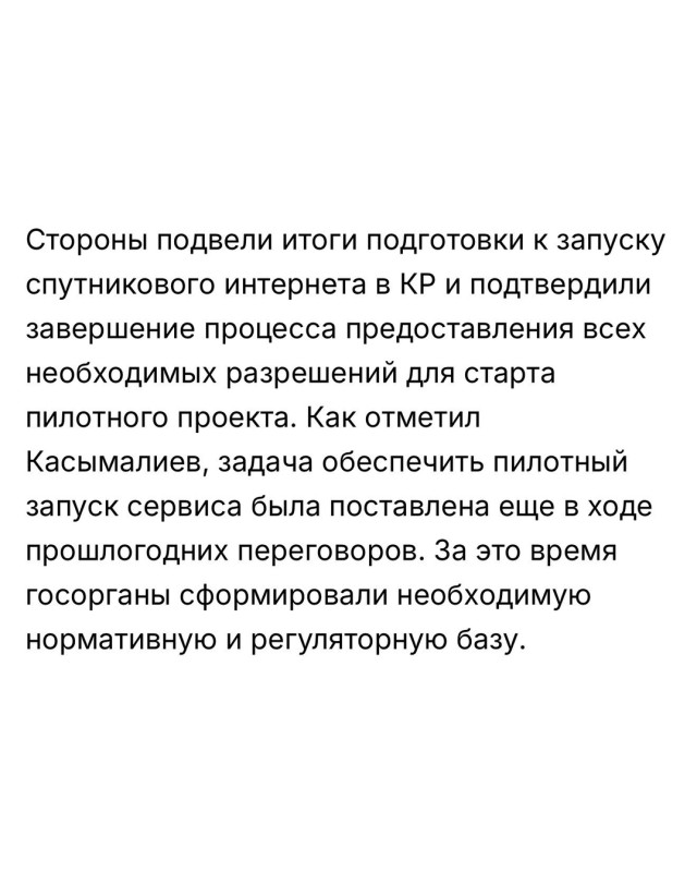 В Кыргызстане в ближайшее время планируют технический запуск пилотного проекта Starlink. Об этом стало известно по итогам встречи главы кабмина КР Адылбека Касымалиева со старшим директором направления Starlink компании SpaceX Райаном Гуднайтом, которая прошла 14 апреля в Вашингтоне на полях Весенних совещаний МВФ и Всемирного банка.