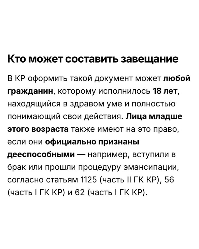 — Оформление завещания — это полезный способ заранее позаботиться о близких. В Кыргызстане закон позволяет гибко распоряжаться имуществом, но, чтобы документ имел силу, важно соблюсти все тонкости: от выбора свидетелей до визита к нотариусу. Разбираем, кто имеет право составить завещание, можно ли лишить кого-то наследства и как правильно оформить свою волю.