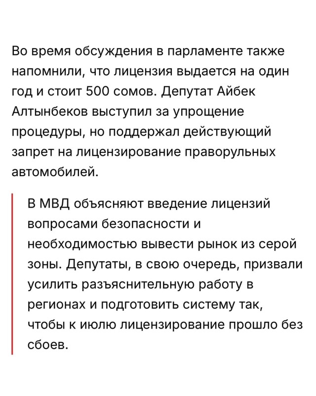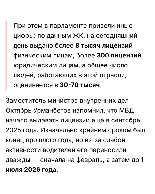 В Кыргызстане требование о лицензиях для водителей такси, работающих через онлайн-сервисы, официально отложили до 1 июля 2026 года. При этом уже с 20 мая оформить лицензию можно будет онлайн через приложение «Тундук». Об этом стало известно 20 апреля на заседании комитета Жогорку Кенеша по промышленной политике и транспорту, где обсуждали исполнение закона «Об автомобильном транспорте».