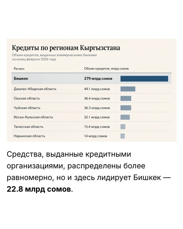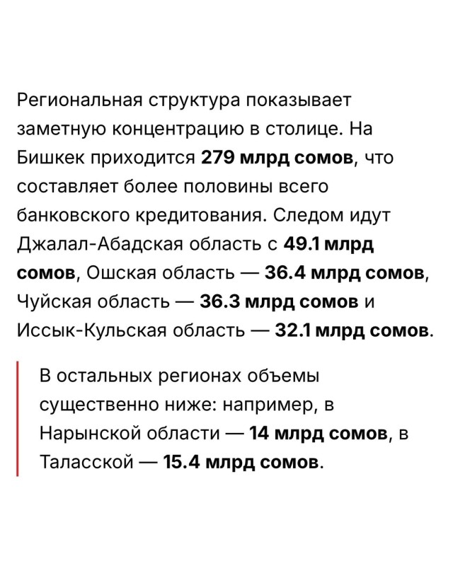 — Общий объем кредитов, выданных коммерческими банками и кредитными организациями в Кыргызстане, на конец 2025 года достиг 574.5 млрд сомов. Редакция Economist.kg проанализировала официальную статистику, чтобы показать, как распределяются кредиты по регионам республики.