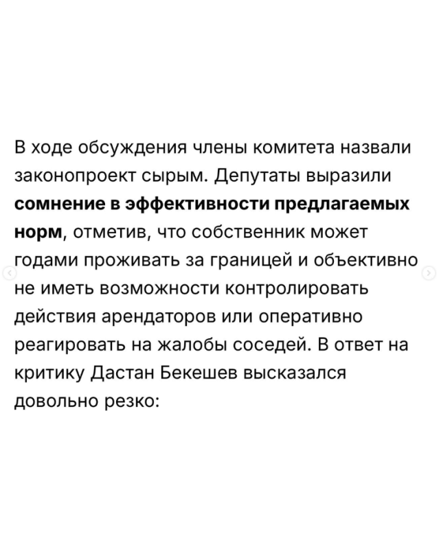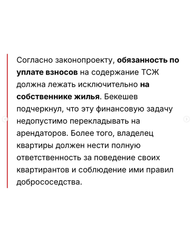 Один из инициаторов документа — Дастан Бекешев — предлагает наделить владельцев квартир персональной ответственностью, которая не должна зависеть от того, проживают они в своей недвижимости сами или сдают ее в аренду.