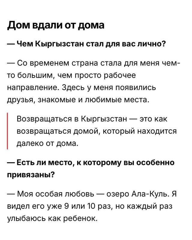 — Мой интерес к Кыргызстану появился благодаря литературе. Я прочитал книги Рышарда Капущинского «Кыргыз сходит с коня» и Чингиза Айтматова «Прощай, Гульсары». Именно они вдохновили меня на первое путешествие в страну.