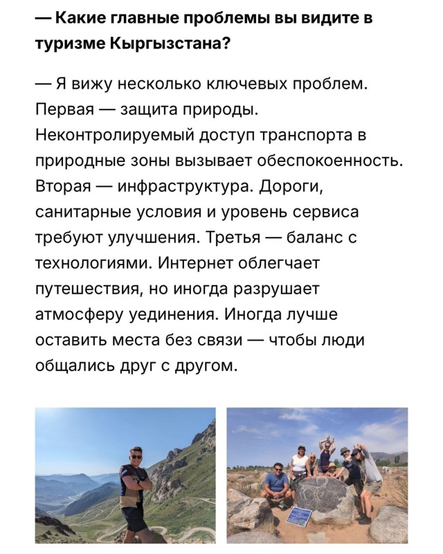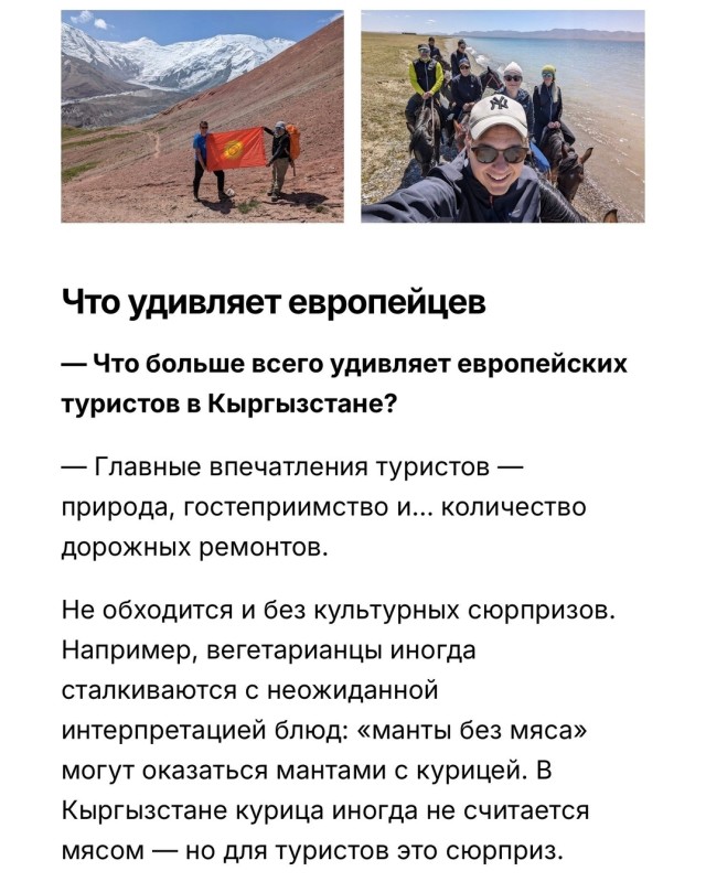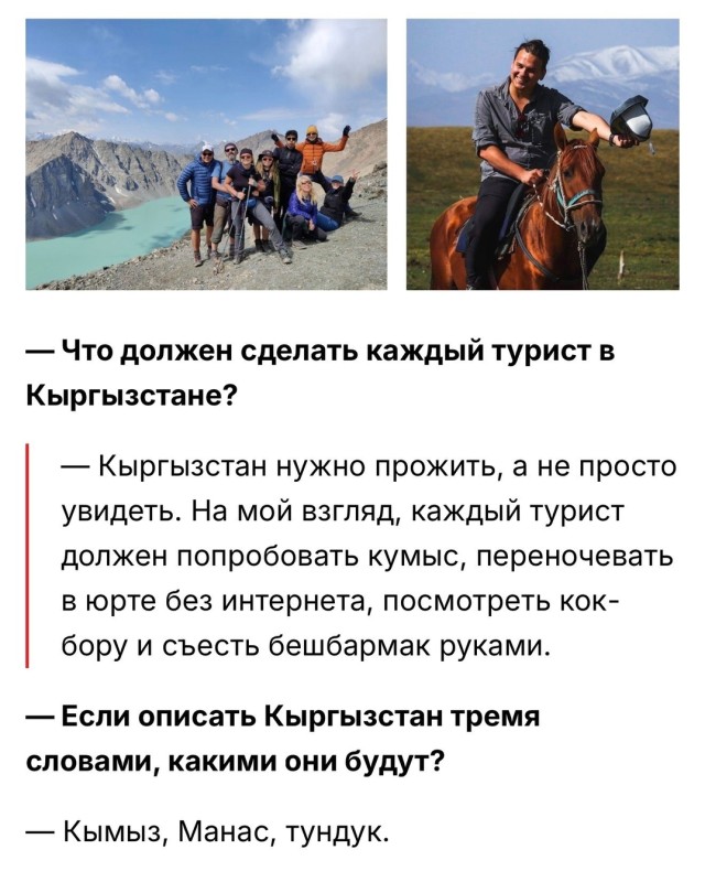 В интервью он рассказал, почему однажды влюбился в Кыргызстан, чем страна удивляет европейцев и какие перспективы есть у местного туризма.