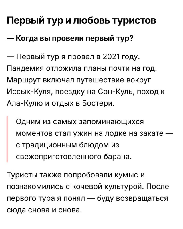 Особую роль играет природа: горы, озера, водопады, ночевки в юртах — и, конечно, гостеприимство местных жителей.