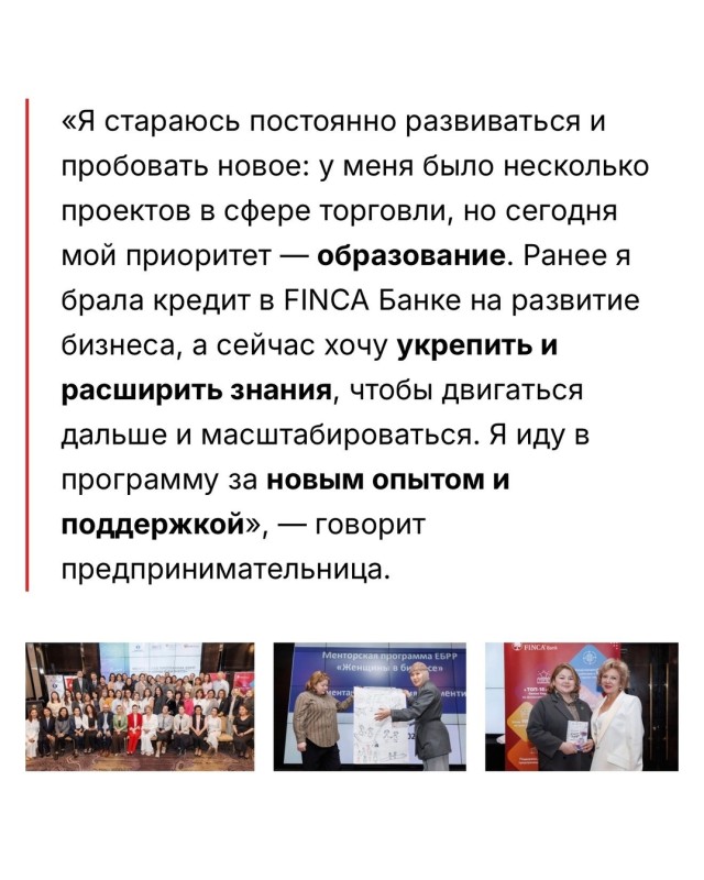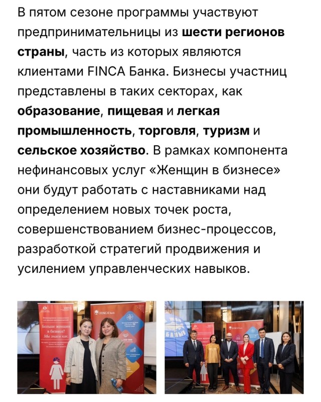 В Кыргызстане стартовал пятый сезон менторской программы для женщин-предпринимателей, реализуемой в рамках нефинансовых услуг (NFS) программы «Женщины в бизнесе» Европейского банка реконструкции и развития (ЕБРР) в партнерстве с FINCA Банком. В новом сезоне участие принимают 36 женщин-лидеров из разных регионов страны, которые в течение семи месяцев будут работать с опытными наставниками над развитием и масштабированием своего бизнеса.