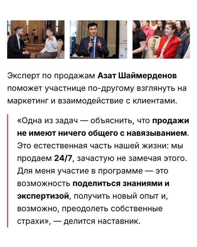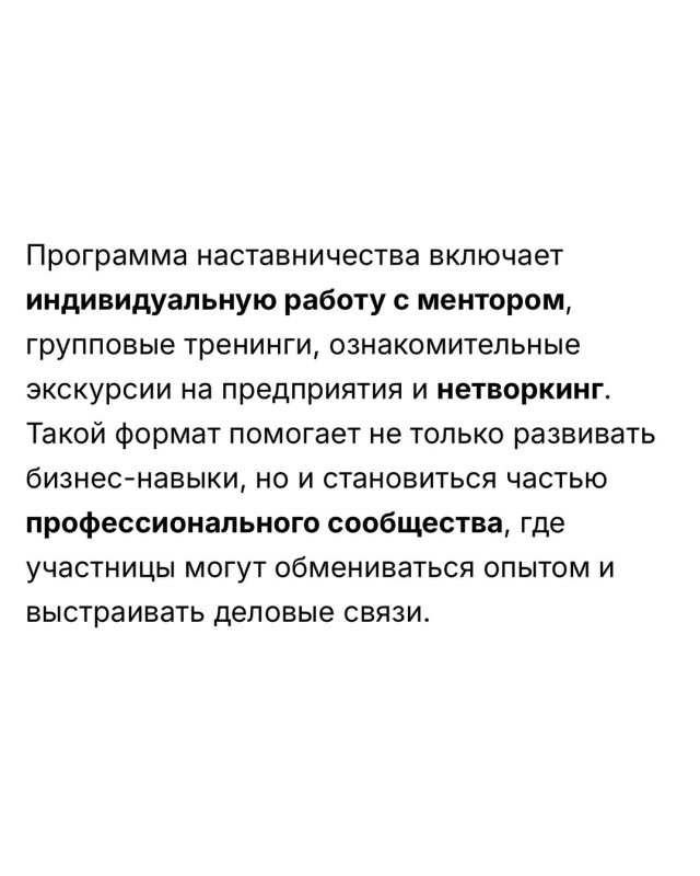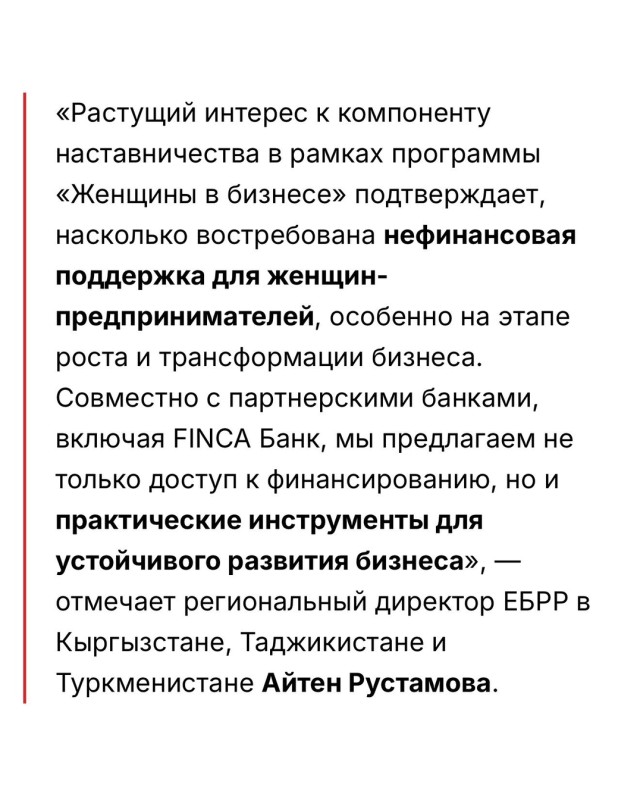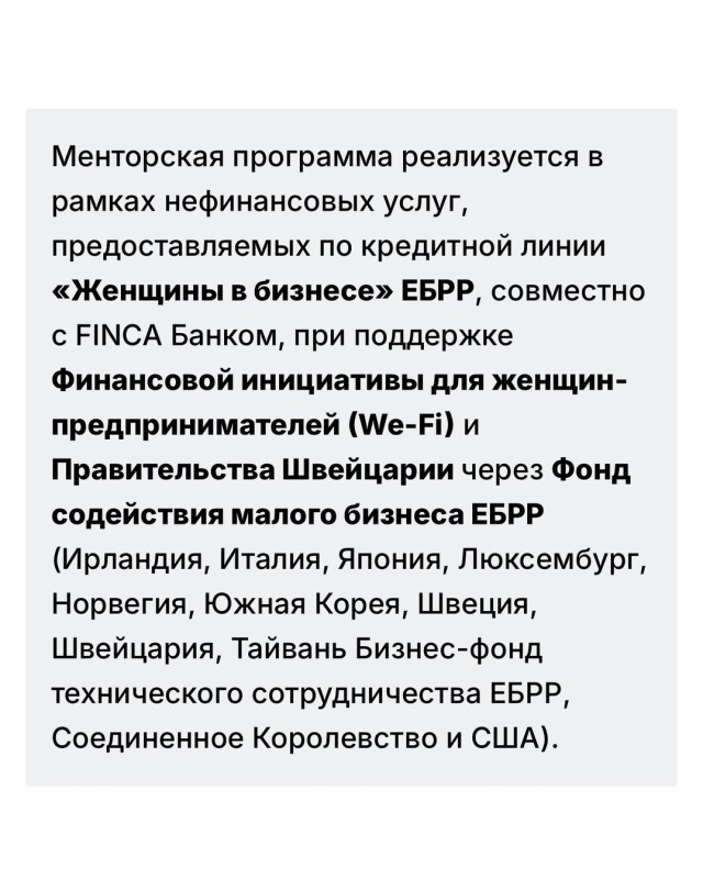 Программа наставничества является неотъемлемой частью комплексного предложения «Женщины в бизнесе» ЕБРР, которое сочетает финансовые инструменты через партнерские банки и нефинансовую поддержку, включая менторство, обучение и развитие управленческих компетенций. С момента запуска инициативы в Кыргызстане в 2019 году в менторской программе приняли участие более 300 женщин, владеющих или управляющих бизнесом не менее двух лет. Многие из них смогли укрепить рыночные позиции, увеличить доходы и расширить географию своей деятельности.